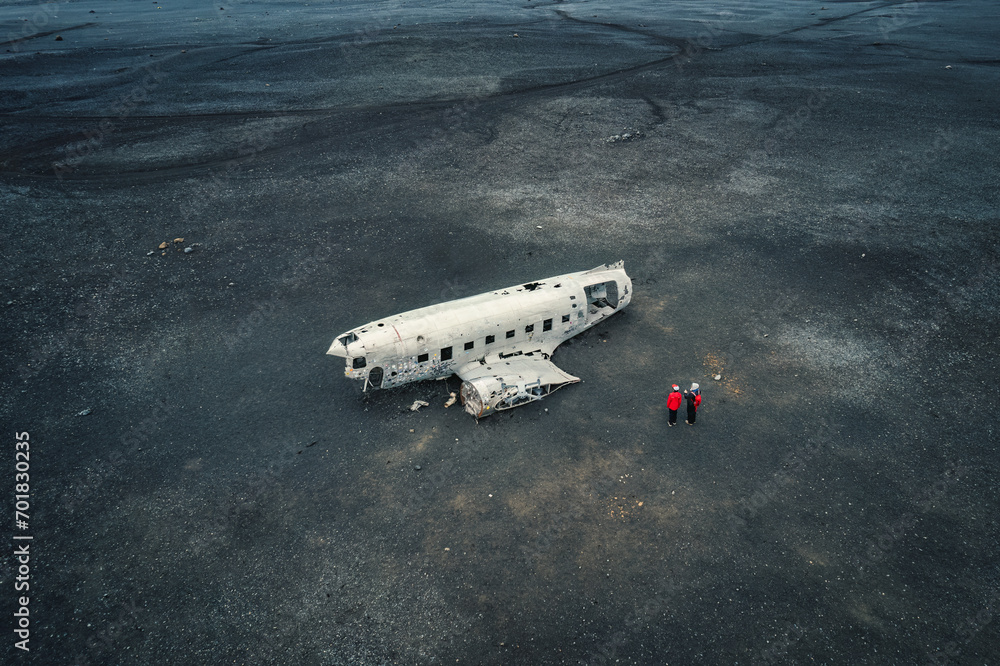 Crashed military DC 3 plane wreck on black sand beach in Iceland