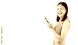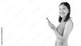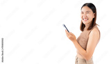Happy excited young asian girl using mobile phone isolated on white background copy space Young girl using smartphone for shopping online chat and texting message She get surprised looking at camera