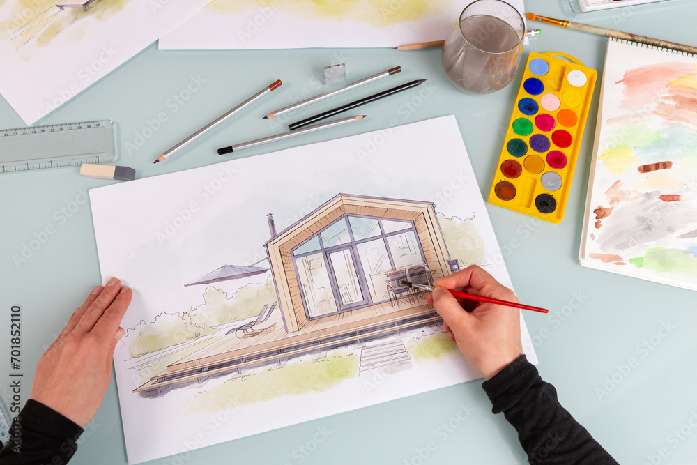 Architect illustrator working on hand drawn illustration of a modular prefabricated house using watercolor paints and brush.