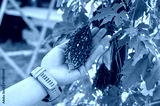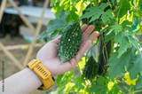 Cropped shot of someone hand holding an unripe Momordica charantia in the garden.