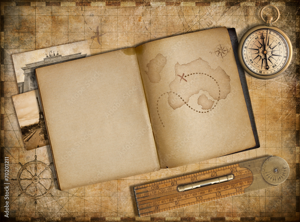 Adventure and travel concept. Vintage map, copybook and compass