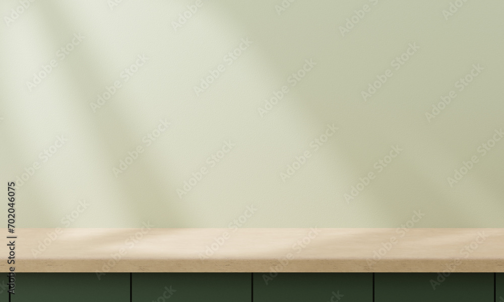 Minimal cozy counter mockup design for product presentation background.Branding in modern style with wood top green counter and cozy pastel wall with soft ray light .Kitchen interior 3D render.