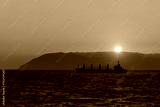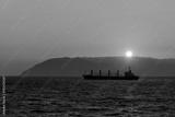 Cargo vessel at sea. Bulk carrier. Dry cargo ship at sunset. Golden hour.