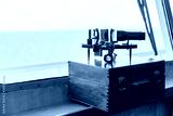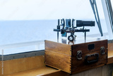 Nautical black sextant placed on wooden box in navigational bridge. Navigational equipment. Celestial navigation.