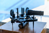 Nautical black sextant placed on wooden box in navigational bridge. Navigational equipment. Celestial navigation.