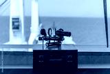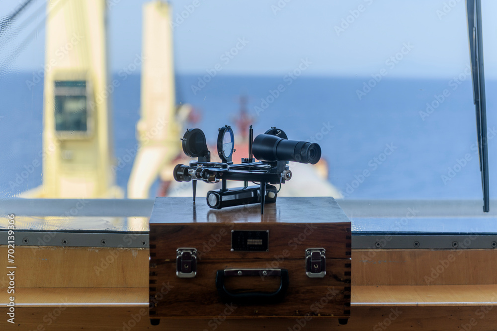 Nautical black sextant placed on wooden box in navigational bridge. Navigational equipment. Celestial navigation.
