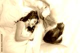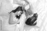 Beautiful asian young lesbian LGBTQ couple or friends lying on bed and looking together smile and relax at home.Top view calm of LGBTQ couple woman love on white bed and head together. LGBTQ Concept
