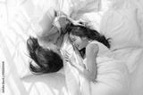 Beautiful asian young lesbian LGBTQ couple or friends lying on bed and looking together smile and relax at home.Top view calm of LGBTQ couple woman love on white bed and head together. LGBTQ Concept