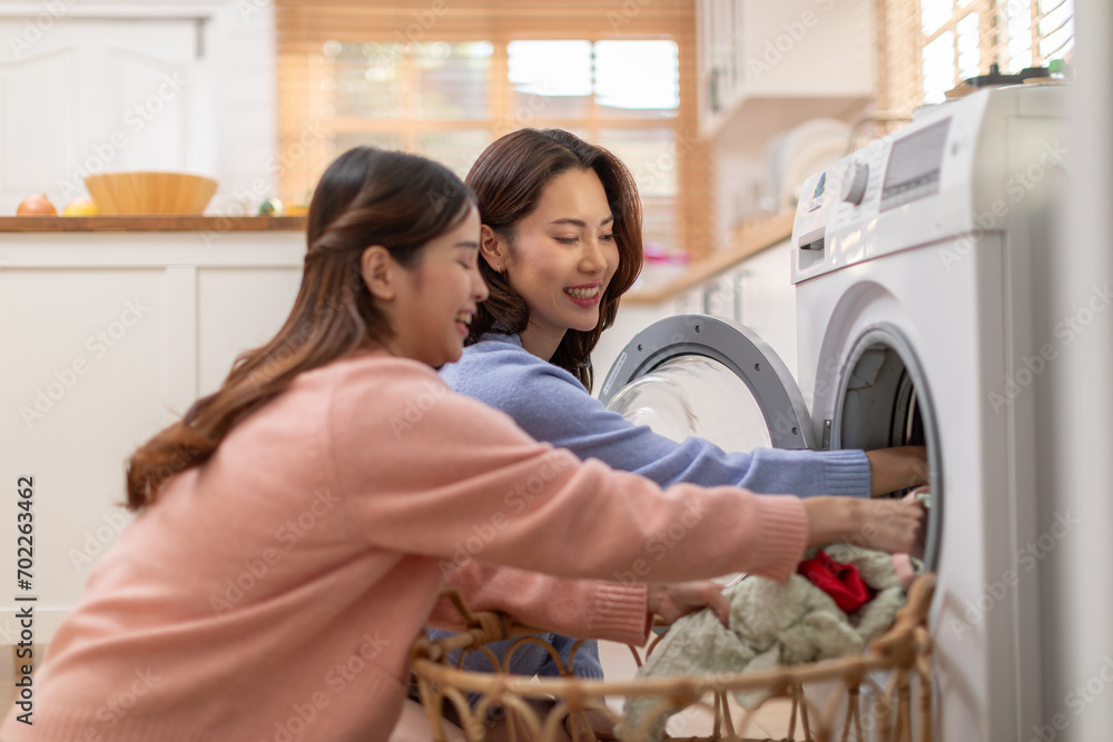 Couple LGBTQ lover doing laundry together smile and laughing. Happiness and tender moment quality time at home. LGBTQ+ Concept