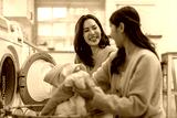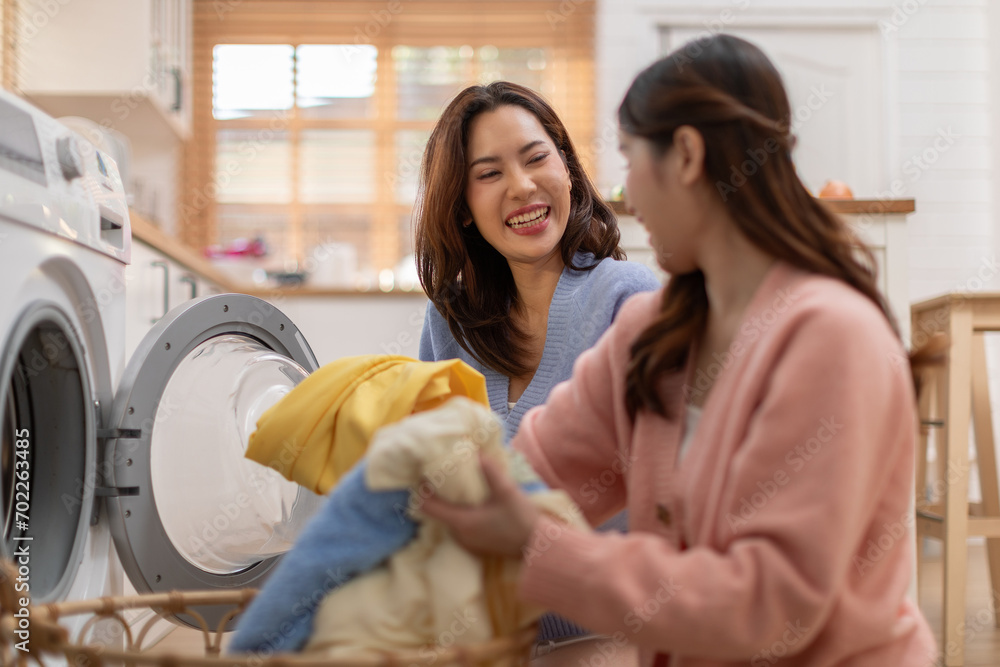 Couple LGBTQ lover doing laundry together smile and laughing. Happiness and tender moment quality time at home. LGBTQ+ Concept