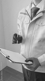 壁紙を点検する作業服の男性|リフォーム調査・見積り イメージ