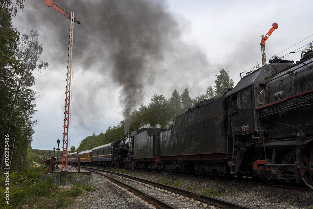 A vintage classic steam locomotive stands at the station, preparing to depart.