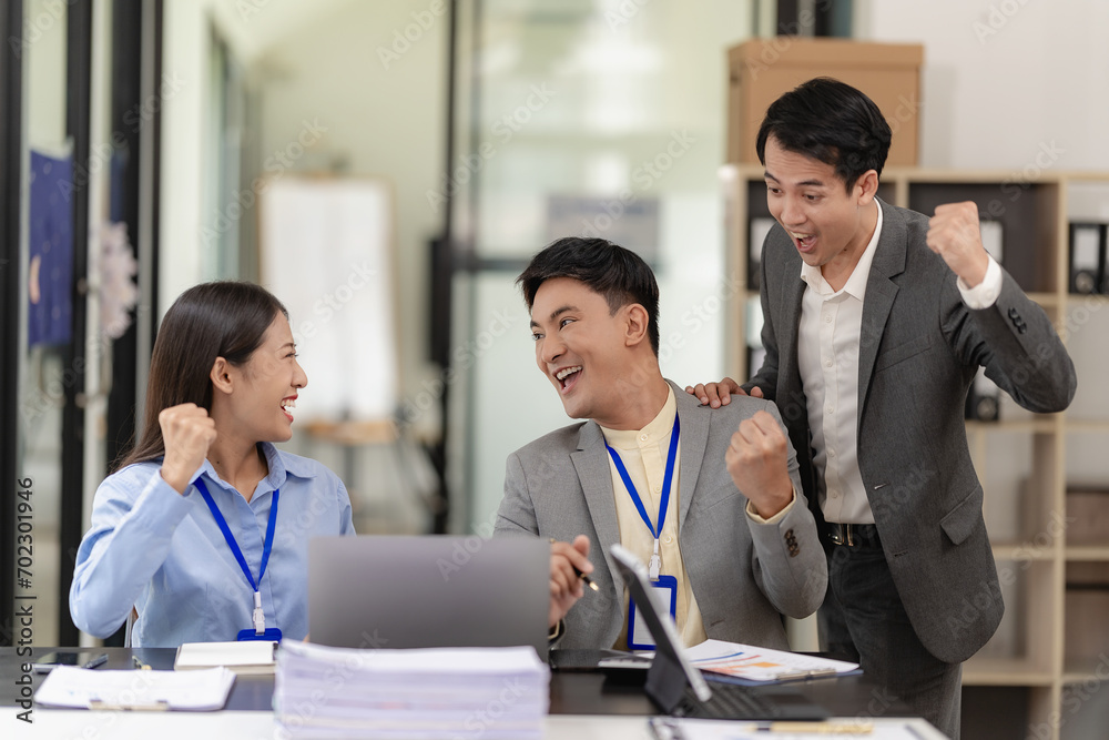 A team of Asian businessmen is excited about the success of their new venture.