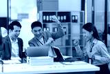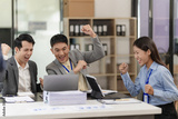 A team of Asian businessmen is excited about the success of their new venture.