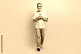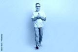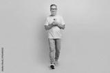 Full size portrait of positive cheerful aged person hold smart phone walking isolated on beige color background