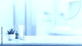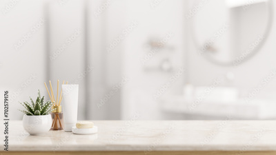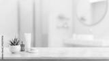 A counter for display your product with a toiletries and a blurred background of a modern bathroom.