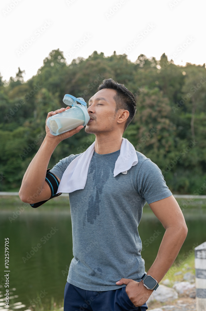 A happy, strong Asian man in sportswear is drinking a protein shake after a long run outdoors.