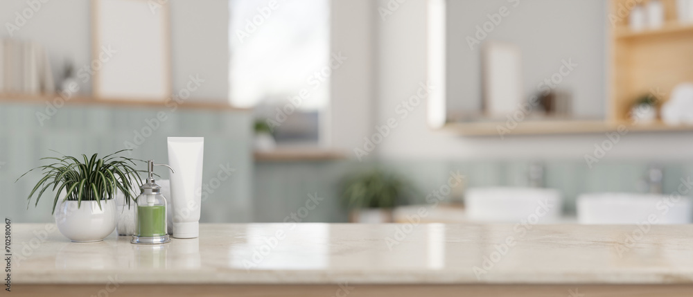 Copy space on a marble tabletop with toiletries set in a modern and clean bathroom.