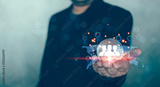 Businessman in suit holding glass with a network structure world map and business digital network technology, Global structure customer network technology. Human icons hologram digital network