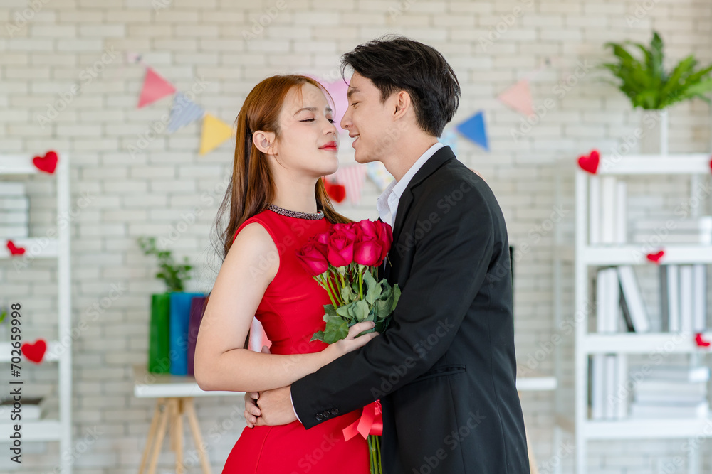 Asian young handsome male boyfriend in formal black suit and beautiful female girlfriend in red dress standing smiling holding red roses flower bouquet together in romantic decorated living room