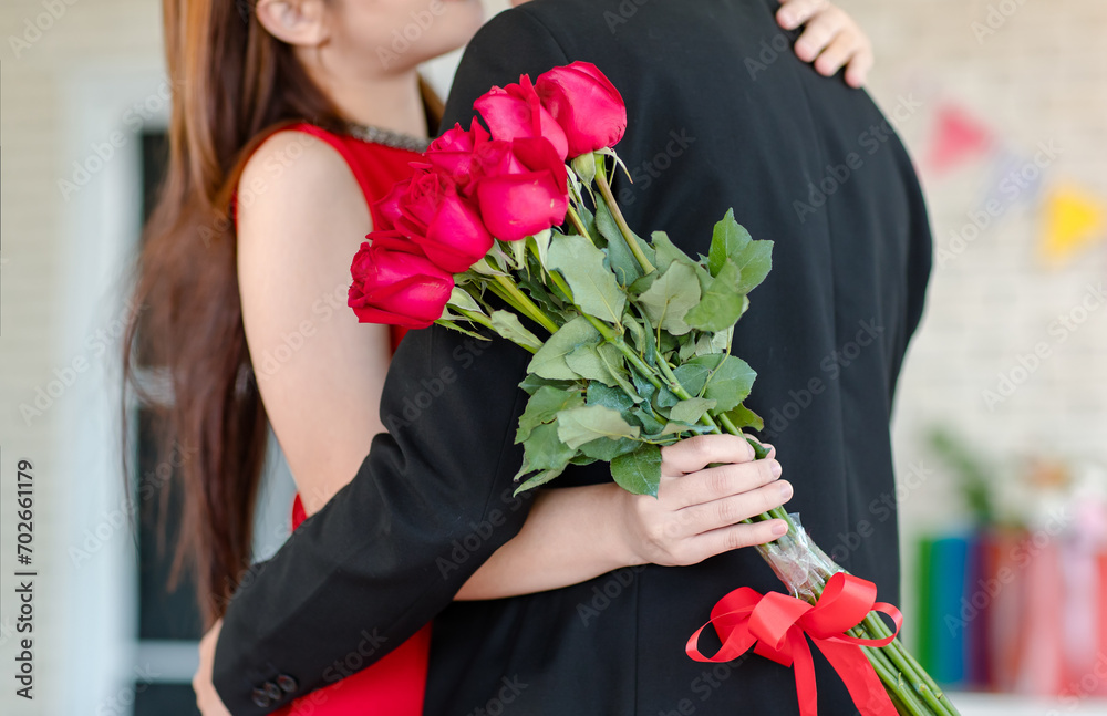 Closeup shot of beautiful red roses flower bouquet in hand of unrecognizable female girlfriend in red dress standing hugging cuddling together kissing with unknown male boyfriend in formal black suit