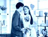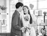 Asian young handsome male boyfriend in red shirt standing hugging cuddling beautiful female girlfriend in white dress giving roses flower bouquet surprising celebrating valentine day in living room