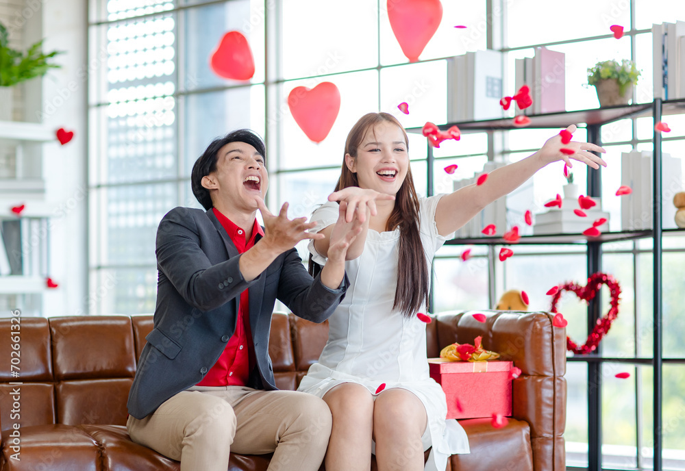 Asian young handsome male boyfriend and beautiful female girlfriend sitting smiling throwing red heart shape paper cutting together on cozy sofa in decorated living room celebrating valentine day