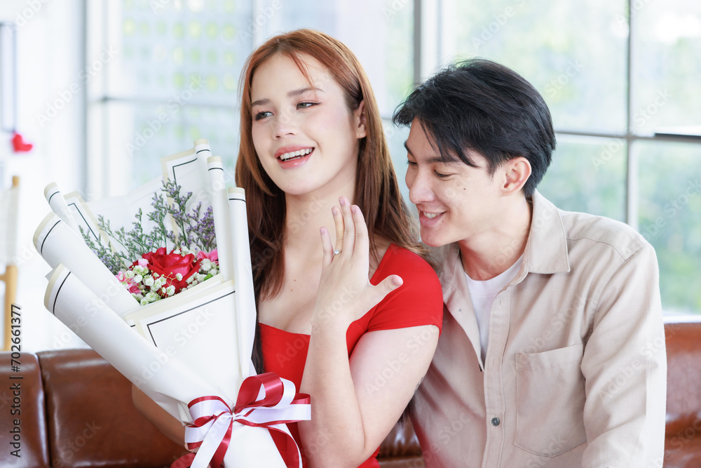 Asian beautiful female girlfriend holding flower bouquet showing diamond engagement ring on finger from handsome male boyfriend who proposing sitting on cozy sofa in living room at home on valentine