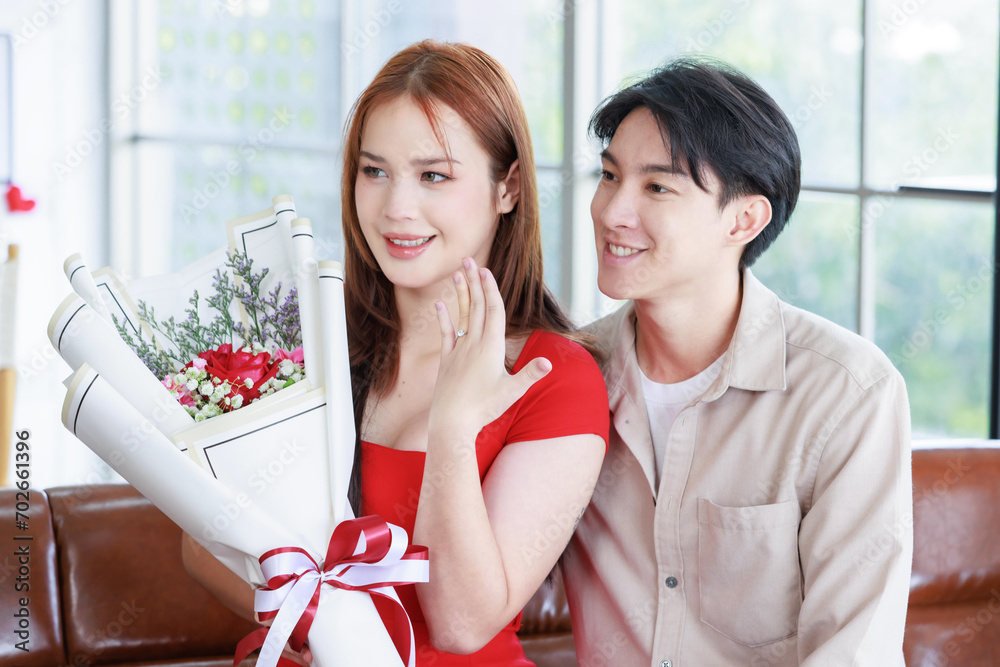 Asian beautiful female girlfriend holding flower bouquet showing diamond engagement ring on finger from handsome male boyfriend who proposing sitting on cozy sofa in living room at home on valentine