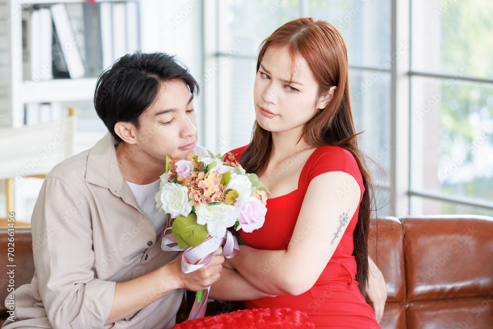 Millennial Asian young handsome male boyfriend reconciling beautiful female sulking upset angry girlfriend in red dress with white roses flower bouquet sit crossed arms on sofa in living room at home