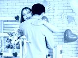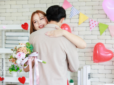 Millennial Asian beautiful female girlfriend standing smiling holding roses flower bouquet hugging cuddling showing love with unrecognizable male boyfriend in decorated living room on valentine day