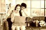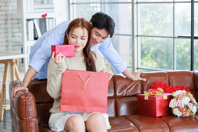 Asian young handsome male boyfriend standing smiling behind beautiful female girlfriend giving red wrapped present gift box in paper bag in romantic decorated living room celebrating valentine day