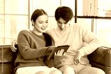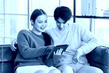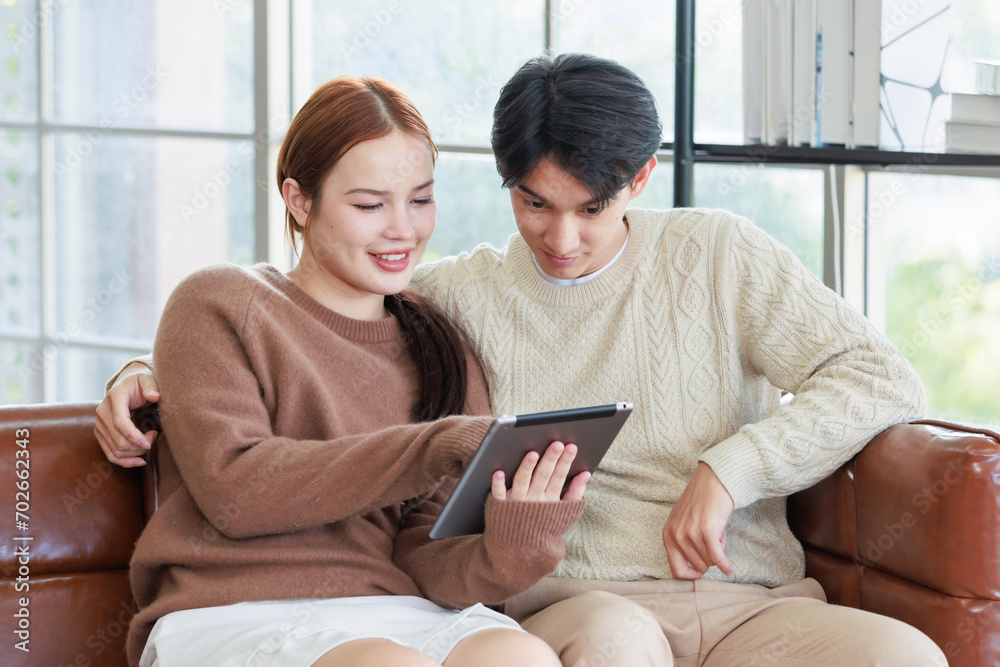 Asian young handsome male boyfriend and beautiful female girlfriend sitting smiling on sofa using tablet computer shopping online via internet together in living room at home