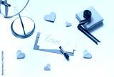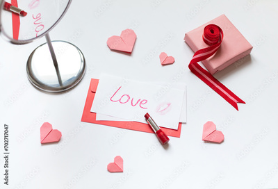Red paper envelope with white blanks, word love written with red lipstick and pink origami hearts. Valentine's day concept card.