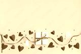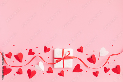 Valentine or mother day festive border with gift or present box and red hearts on pastel pink background top view. Flat lay greeting card.