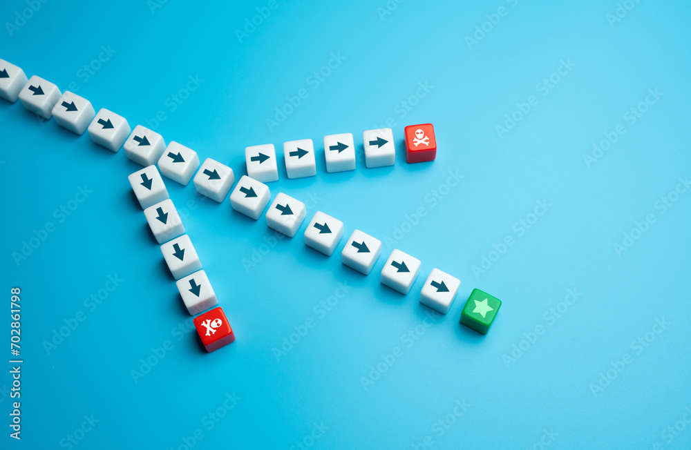 A fork leading to success or loss. Branches of the road leading to failures. Stay the right course. Success or failure depends on choice. Alternative solutions have failed.