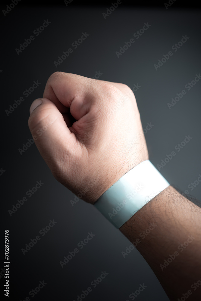 Blue paper wristband mockup on persons arm. Empty adhesive bangle wristlet sticker on male hand, blue paper bracelet, check tape, event ticket concept
