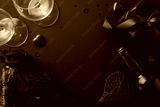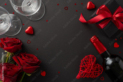 Birthday bash sophistication. Overhead shot featuring refined table setting with assorted chocolates, wine bottle, glasses, giftbox, vibrant roses, celebratory confetti on chic black surface, ad space