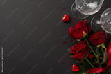 Upscale Love Affair: Overhead shot of a sophisticated dining setting, featuring wineglasses, heart-shaped chocolates, bouquet of roses, and confetti against a chic black backdrop