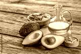 Healthy Fat avocado oil nuts on a wooden background. top view, omega 3, Vegan food