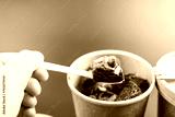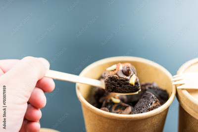 Hand scoop a piece of delicious chocolate brownie topping with almond and chocolate chip.