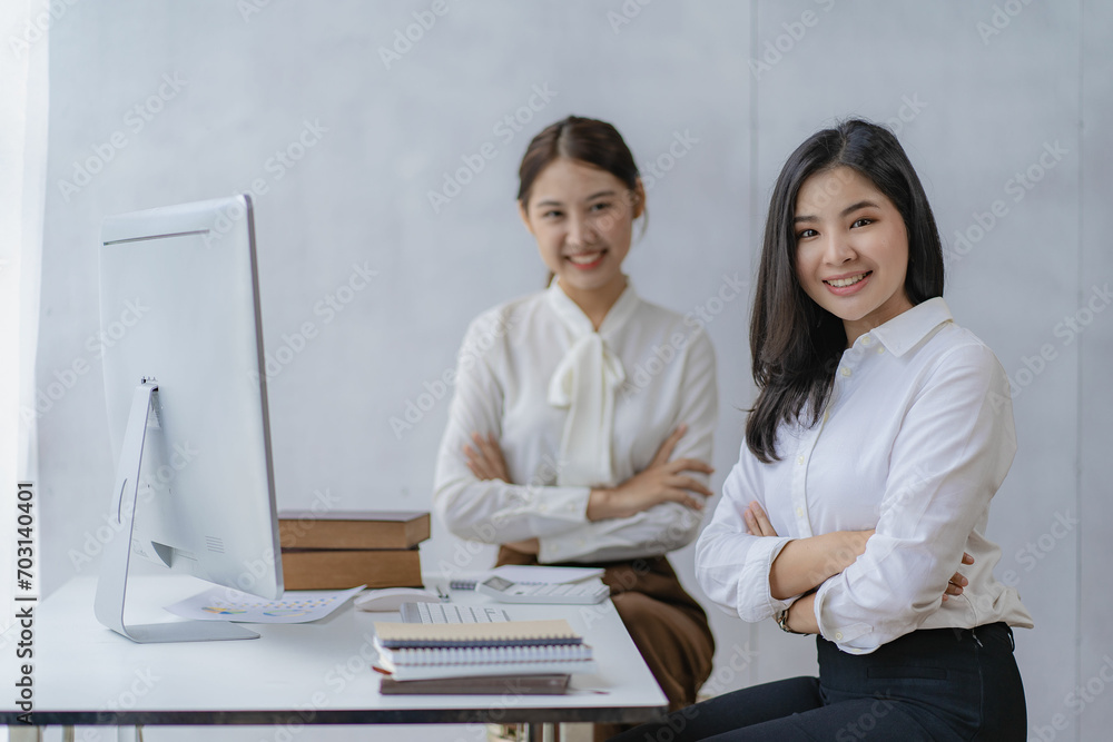 Two Asian female accountants have team meeting to summarize financial information in business office, creative female executive using tablet PC and smiling