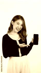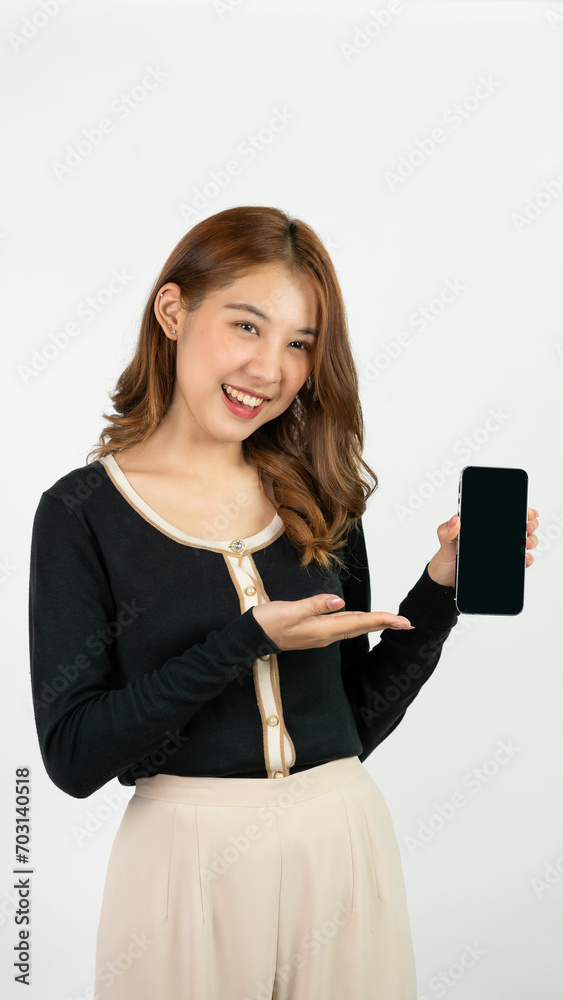 Excited smiling Asian woman holding mobile phone and looking happy standing on white background.