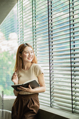 Photo of an attractive young Asian woman writing a diary. A freelance woman is relaxing in writing a story about work. beautiful asian woman