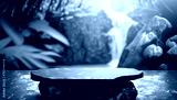 white stone podium table top in outdoor waterfall green tropical forest nature blured background