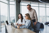 Three employees in a modern office, a man and a woman work at a table, colleagues discuss and consult, thinking about a joint project.