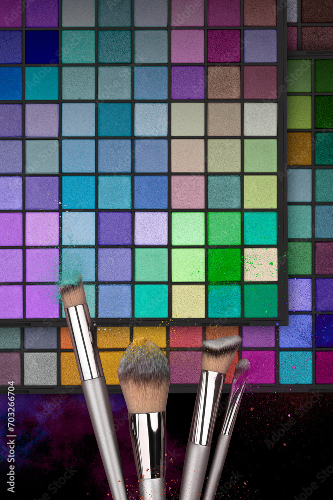 Bright eye shadow, blush brushes, explosion of multicolored powder dust on black background. Highly vibrant color-pressed pigment palettes for make-up. Abstract background for cosmetic concept.