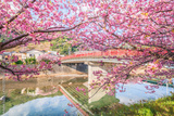 春の河津町 満開の河津桜と河津川に架かるやかた橋【静岡県】 Kawazu cherry blossoms blooming in Kawazu Town, a famous cherry blossom spot in Shizuoka - Japan