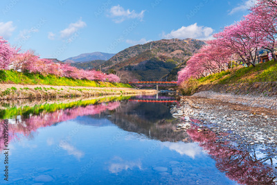 河津町の春景色 河津川沿いに咲く河津桜【静岡県】 Kawazu cherry blossoms blooming in Kawazu Town, a famous cherry blossom spot in Shizuoka - Japan