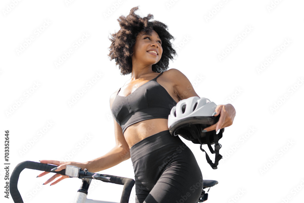 Female athlete eco transport uses a bicycle daily workout in sportswear, transparent background.